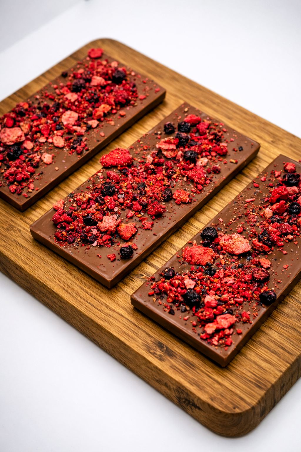 Sütlü çikolatanın kadifemsi yapısına, üzerine eklenen dondurularak kurutulmuş meyvelerin doğal asiditesi eşlik eder.